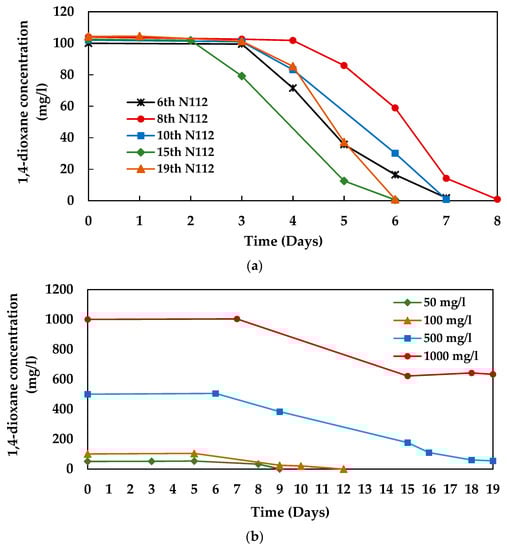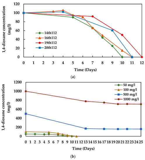 1,4-dioxane degradation profile of the consortium 112, (a) by different generations and (b) at different initial 1,4-dioxane concentrations (by 14th generation).