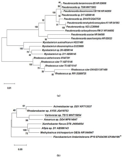 Neighbor-joining phylogenetic tree of (a) Pseudonocardia sp. TS06 (underlined) with previously reported gram-positive 1,4-dioxane-degraders and (b) Variovorax sp. TS13 (underlined), with previously identified gram-negative 1,4-dioxane-degraders. The bootstrap values were based on 1000 replications. * The Flavobacterium lindanitolerans IP10 was not a dioxane-degrader but was used in the analysis since it was 99% similar to 1,4-dioxane-degrader Flavobacterium [].
