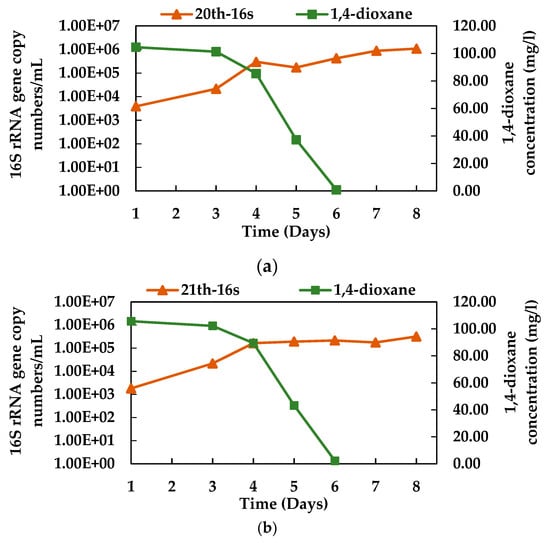 Growth of the enriched microbial consortia N112 with the degradation of 1,4-dioxane at different generations, (a) 20th generation and (b) 21st generation. Here, the rectangles indicate 1,4-dioxane concentrations and the triangles represent the overall growth of consortium N112, using 16S rRNA gene copy numbers/mL.
