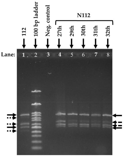 RISA was performed to investigate the microbial community structures of consortium 112 and N112. The results of RISA revealed that the microbial community structure of N112 was different from the consortium 112. The DNA bands obtained from RISA depicted that the consortium 112 was composed of five bacterial species, whereas the consortium N112 obtained from consortium 112 consisted of four bacterial species (Figure 6). The change in the microbial community structure might be the reason behind the improved 1,4-dioxane degradation ability of the consortium N112, as compared to consortium 112. However, cell aggregation was also observed for consortium N112 like that in consortium 112, which exhibited that the major 1,4-dioxane-degraders present in 112 might also be present in the consortium N112. The observed DNA bands also confirmed that consortium N112 was a stable 1,4-dioxane-degrading microbial consortium.