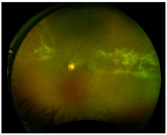 - Holland, G.N.; Van Natta, M.L.; Goldenberg, D.T.; Ritts, R., Jr.; Danis, R.P.; Jabs, D.A. Relationship Between Opacity of Cytomegalovirus Retinitis Lesion Borders and Severity of Immunodeficiency Among People With AIDS. Invest. Ophthalmol. Vis. Sci. 2019, 60, 1853–1862. [Google Scholar] [CrossRef] [PubMed]