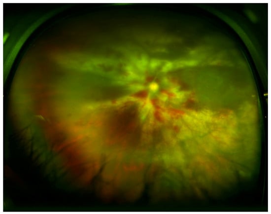 There are three main clinical variants of CMVR [91]. The first is an indolent variant where the main retinal manifestations are granular, white areas of progressive necrotizing retinitis with minimal to no hemorrhage, often in the peripheral retina (Figure 1). The second is a fulminant form characterized by full-thickness yellow-white lesions with retinal hemorrhage in a sectoral, perivascular distribution (Figure 2). The third variant is a perivascular form, also described as “frosted branch angiitis”. The most distinctive feature of CMV retinitis is an opaque, white lesion border, reflecting retinal edema and necrosis. This opacification tends to be greater with patients with greater degrees of immunosuppression [21]. As CMVR progresses, the retina becomes atrophic and can develop tears which can result in retinal detachment.