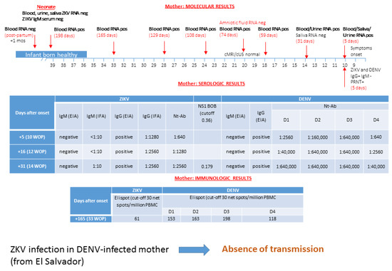 Data on molecular, serological, and immunological diagnosis for Zika virus (ZIKV) and Dengue virus (DENV) infection in a pregnant woman from El Salvador are shown. ZIKV infection in the DENV-infected mother was documented and transmission was not reported. cMRI/cUS: cerebral magnetic resonance imaging/cerebral ultrasonography; PRNT: plaque reduction neutralization test; WOP: week of pregnancy; EIA: enzyme immunoassay; IFA: immunofluorescence assay; Nt-Ab; neutralizing antibodies. In the box of molecular diagnosis, black numbers specify the week of pregnancy, while red numbers in brackets indicate the exact day of gestation. The blockade-of-binding (BOB) assay result is expressed as the ratio of inhibition, while the ELISpot assay is measured as net spots/million PBMC.
