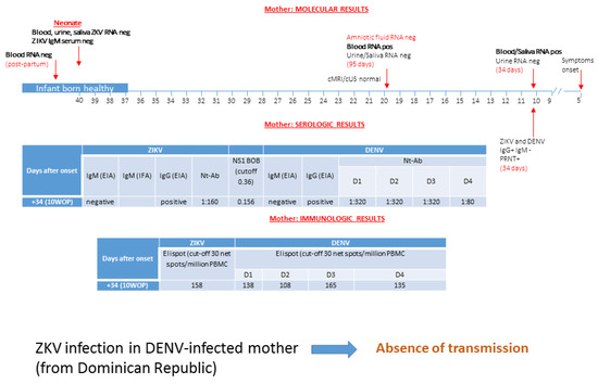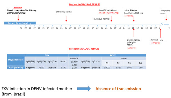 3.1. Patient 1: Absence of ZIKV Transmission in DENV-Experienced Mother