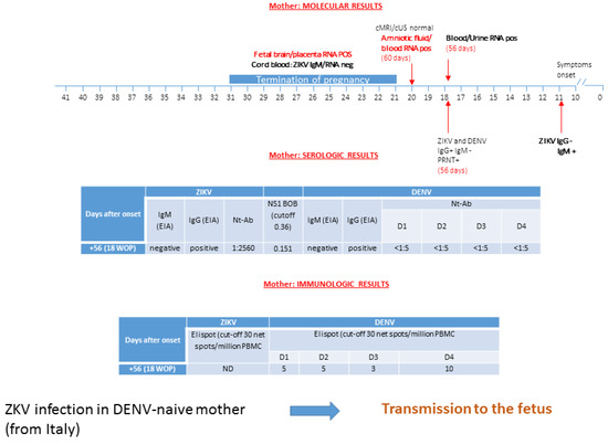 ZIKV infection in a DENV-naïve mother is reported. Diagnosis was performed using molecular, serological, and immunological assays, and transmission to the fetus was reported. cMRI/cUS: cerebral magnetic resonance imaging/cerebral ultrasonography; PRNT: plaque reduction neutralization test; WOP: week of pregnancy; EIA: enzyme immunoassay; IFA: immunofluorescence assay; Nt-Ab; neutralizing antibodies. ND: not done. In the box of molecular diagnosis, black numbers specify the week of pregnancy, while red numbers in brackets indicate the exact day of gestation. BOB assay result is expressed as the ratio of inhibition, while ELISpot assay is measured as net spots/million PBMC.