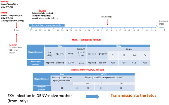 A native 26 year-old Brazilian woman reported symptoms of maculo-papular rash, arthralgia, and asthenia at approximately seven weeks before pregnancy in Brazil. She underwent in loco ZIKV serologic testing at eight weeks of pregnancy (107 days after onset symptoms). ZIKV IgG testing was positive with specific IgM negative. As her husband was from Lombardy, Italy, the couple decided to refer to our hospital in Pavia for further diagnostic investigation and counseling. She was screened for ZIKV and other flavivirus. At 15 weeks of pregnancy (154 days after onset), a urine sample was positive for ZIKV RNA, while plasma and saliva were negative (Figure 2). The mother showed positive ZIKV and DENV IgG and negative ZIKV and DENV IgM, and virus-neutralizing antibodies positive at a higher titer for DENV 1 with respect to ZIKV NS1 blockade-of-binding assay were able to discriminate ZIKV from DENV infection. Unfortunately, ELISpot assay for DENV and ZIKV had not yet been developed at that time. Neurosonography performed at 20 weeks of pregnancy did not show fetal brain abnormalities. ZIKV RNA was not detected in amniotic fluid, and additional maternal plasma and urine collected for testing were negative as well. At 28 weeks of gestation, fetal cMRI was performed in Brazil and no cerebral malformations were observed. A healthy baby was delivered and absence of ZIKV congenital infection was confirmed at birth (Figure 2).