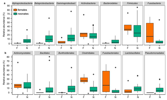 Relative abundances of the most common “phyla” (a) and orders (b) in neonates and females. Relative abundances of the presented “phyla” and orders were >1% and >5%, respectively. Boxplots present the median, 25th and 75th percentiles and, if applicable, outliers. Green boxes are neonates (N). Orange boxes are females (F). Stars indicate significant differences between neonates and females.