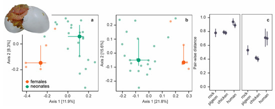 We further explored (dis)similarities between neonatal and female bacterial communities by comparing phylogenetic (unweighted and weighted UniFrac distances) and taxonomic (Bray−Curtis dissimilarities) composition using principal coordinate ordination analysis (PCoA) of variance stabilizing transformed abundances. Unweighted and weighted UniFrac distances (Figure 2a,b) and Bray−Curtis dissimilarities (supplementary information Figure S5a) differed between neonates and females (all PERMANOVA p = 0.001, r2 < 0.15). Phylogenetic and taxonomic community composition differed also between neonatal and female microbiomes in chickens [20] and mammals [17,47,48,51] (but see [52]) and seems a common phenomenon.