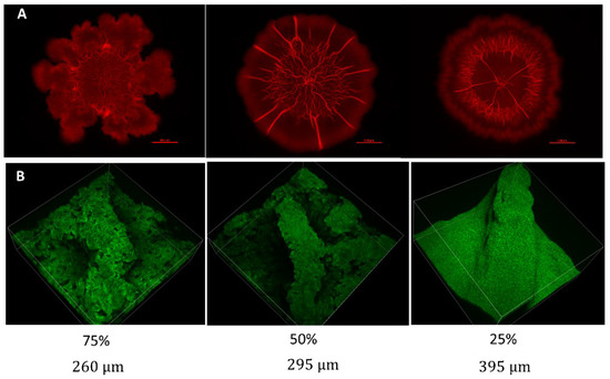 - Seminara, A.; Angelini, T.E.; Wilking, J.N.; Vlamakis, H.; Ebrahim, S.; Kolter, R.; Weitz, D.A.; Brenner, M.P. Osmotic spreading of Bacillus subtilis biofilms driven by an extracellular matrix. Proc. Natl. Acad. Sci. USA 2012, 109, 1116–1121. [Google Scholar] [CrossRef]