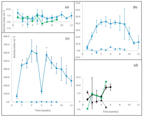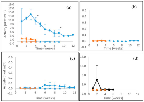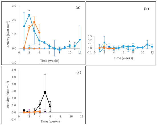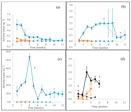 Activities of β-glucosidase lower than 1 nkat mL−1 were observed for the white rot fungus P. radiata on birch wood with the highest activity levels produced during the first 2 weeks of cultivation followed by a decline (Figure 3a). For the brown rot fungus F. pinicola, an opposite profile of β-glucosidase activity was observed with an increase during the first 3 weeks up to significant (p ≤ 0.05) steady levels of activity (1.5 nkat mL−1) on birch wood observable until cultivation week 7 followed by a rapid decrease to 0.3 nkat mL−1 on week ten (Figure 3b). The dashed black line in Figure 3b indicates this drop, which presented high standard deviation (high error bars) between the three parallel culture flasks. Only negligible β-glucosidase activities were observed on the liquid ME medium for P. radiata or F. pinicola. (Figure 3a,b).