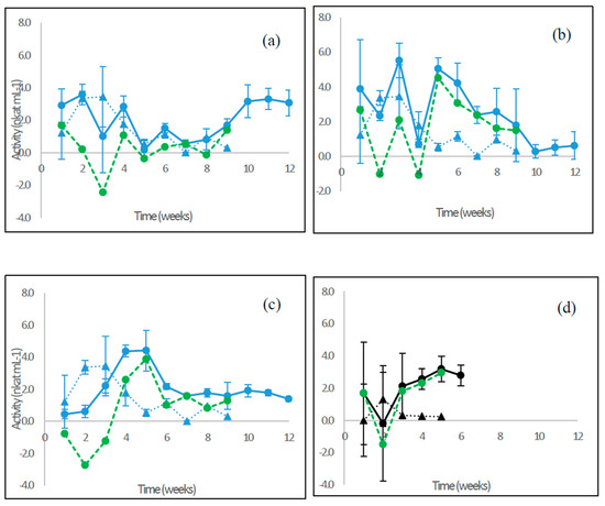 Xylan cleaving activities were produced by the fungi in variable levels and profiles, especially on the lignocellulose substrates (Figure 5). The most fluctuating activity was observed on birch wood cultivations of P. radiata (Figure 5a). The net activity estimated (green line) slight low value peaks on cultivation weeks three and five (between 4 to 5 nkat mL−1), but due to the high standard deviation observed between the culture flasks, no further predictions on the enzyme production could be made.