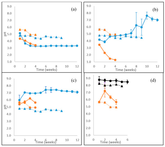 The generation of acidity in the cultivations was followed each week by measuring the pH values of the centrifuged liquid samples at room temperature using an Orion 920A pH-meter equipped with a glass pH combinatory electrode (Thermo Fisher Scientific, Waltham, MA, USA). Results are presented as mean values with a standard deviation of the three biological replicate flask cultures.