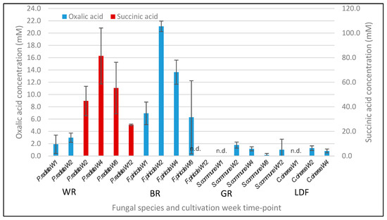 Accumulation of organic acids in the fungal solid-state cultures on lignocellulose substrates at weekly time points. Organic acids were measured by HPLC analysis of culture fluid samples. W1–W12; cultivation week 1–12. Concentration of fumaric acid in the cultures of C. cinerea on barley straw was lower than the detection limit (<0.5 mM) and thereby invisible in the figure. Mean value (n = 3) is presented at each week time point. Bars indicate the standard error. n.d., not detected; WR, white rot; BR, brown rot; GR, grey rot, intermediate decay type; LDF, litter-decomposing fungus.