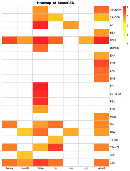 - Shi, H.; Schwab, W.; Yu, P. Natural occurrence and co-contamination of twelve mycotoxins in industry-submitted cool-season cereal grains grown under a low heat unit climate condition. Toxins 2019, 11, 160. [Google Scholar] [CrossRef]