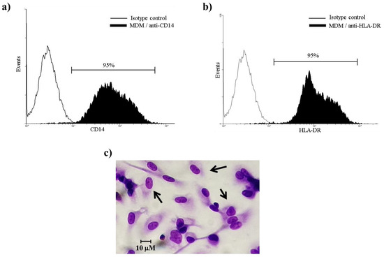 Purity and morphological identification of monocyte-derived macrophages (MDMs). CD14 and HLA-DR surface expression on MDM cells were evaluated after seven days in culture. (a) MDM cells were stained with isotype control Ab (IgG2) or (b) isotype control antibody (IgG1) and anti-HLA-DR-PE, and (c) morphology was identified by standard Giemsa staining. Results are from four healthy donors analyzed.