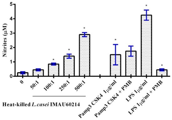 The treatment of MDMs with heat-killed L. casei IMAU60214 at a ratio (bacteria/MDM) of 100:1, 250:1, and 500:1 for 24 h induced NO level elevation compared to the control negative (Figure 2). The highest induction was observed with (500:1, 250:1, 100:1) under these experimental conditions. In addition, the stimulatory activity of heat-killed L. casei IMAU60214 also revealed a dose-dependent increase in extracellular nitrate accumulation, a biochemical measure of NO release. Exposure to Escherichia coli 0111:B4 lipopolysaccharide (LPS, 1 μg/mL) induced NO release that was substantially greater than that produced by the probiotic heat-killed bacteria. However, the treatment with polymyxin B (an LPS inhibitor) effectively inhibited the NO production induced by LPS but had no effect on Pamp3CK4-induced NO production, indicating that enhanced NO production by L. casei IMAU60214 was not the result of endotoxin contamination.