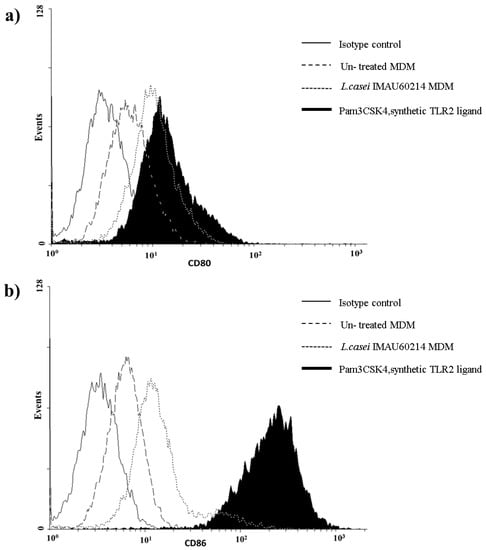 Heat-killed L. casei IMAU60214 increases surface expression of CD80 and CD86 by MDMs. Macrophages were cultured in medium alone, 1 µg/mL of the Toll-like receptor 2 (TLR2) agonist Pam3CSK4 (positive control), or L. casei IMAU60214 at a ratio (500:1) for 24 h. Cells were then fixed and stained with isotype control, FITC-labeled anti-CD80, or PE-labeled anti-CD86. (a) CD80 and (b) CD86.