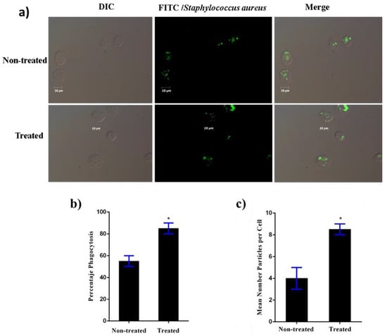 Heat-killed L. casei IMAU60214 increases the phagocytosis of Staphylococcus aureus by MDMs. Phagocytosis was evaluated by counting phagocytic macrophages, and the number of engulfed particles in randomly selected fields of untreated and treated MDMs with L. casei IMAU60214 (at a ratio of 500:1 for 24 h) was challenged with FITC S. aureus at a ratio 10:1 (bacteria/MDM). (a) Differential contrast (DIC) micrograph showing FITC-S. aureus fluorescence in MDMs. (b) Percentage of phagocytosis. (c) Mean number of particles phagocytized per cell. * A p < 0.05 was considered for statistical significance compared to untreated controls for percentage phagocytosis and mean number particles per cells, respectively.