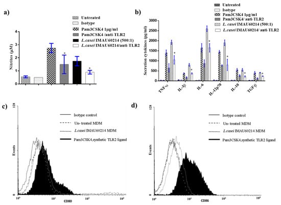 Effects of heat-killed L. casei IMAU60214 on MDMs are dependent on the activation of Toll-like receptor 2. MDMs were pre-incubated with anti-TLR2 (10 μg/ml) for 1 h prior to stimulation by L. casei IMAU60214 (at ratio of 500:1) or Pam3CSK4 (1 μg) as a positive control for 24 h. Control MDMs were left untreated as a negative control. (a) NO accumulation. (b) Cytokine production. * Statistically significant p < 0.05 difference between conditions. (c) CD80 and (d) CD86.