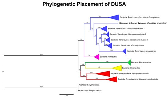 The microbiome of A. bruennichi was dominated by a single ASV, making up 84.56% of all filtered reads (Figure 1). This ASV had less than 85% identity to any sequence in the NCBI (National Center for Biotechnology Information) database. Long read sequencing of two samples generated a near full length 16S rRNA gene amplicon sequence corresponding to the dominant ASV, which allowed us to further investigate the identity of this dominant symbiont (Table 1). All low-similarity matches originated from environmental samples and uncultured microbes. There was no match to a named taxon, making it difficult to classify the sequence taxonomically. An exploratory gene tree (Figure 2) placed the sequence within the Tenericutes, which are gram-negative, cell-associated bacteria that have lost their cell walls [75]. We refer to this dominant unknown symbiont as DUSA (dominant unknown symbiont of Argiope bruennichi) henceforth.