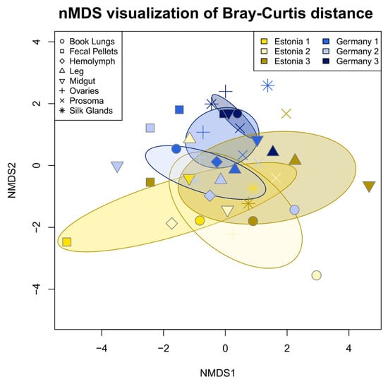 nMDS ordination based on Bray-Curtis distance of 16S rRNA gene sequence variant relative abundance (excluding DUSA) revealed the slight, but significant, differentiation of the Argiope bruennichi bacterial community composition according to population (Estonia or Germany in the legend) and individual (denoted by number in the legend) as well as the interaction between the two. Single points represent sequenced tissue samples and the shape of the point represents the tissue type. Shared color denotes tissue samples taken from a single individual spider. Shades of yellow represent spiders collected from Estonia, while shades of blue represent spiders collected from Germany. Ellipses represent the 99% confidence interval based on standard error.
