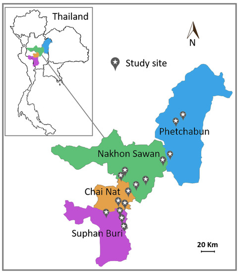 A total of 36 samples of green and healthy leaves of corn (Zea mays Linn.) for animal feed were collected in cultivation fields from 15 districts (sampling sites) in four provinces in Thailand (Figure 1) between July 2016 and October 2016 (Table 1). Each sample was a composite sample consisting of at least five leaves collected from different corn plants in a small area. Leaves were kept in plastic bags and stored at 8 °C and yeast isolation was carried out within 3 days after collection.