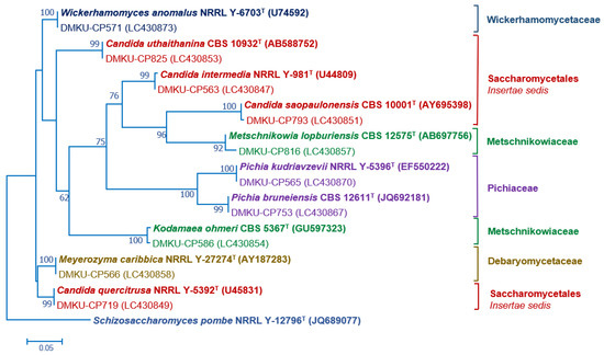 - Kurtzman, C.P.; Robnett, C.J. Identification and phylogeny of ascomycete yeasts from analysis of nuclear large subunit (26S) ribosomal DNA partial sequences. Antonie Leeuwenhoek 1998, 73, 331–371. [Google Scholar] [CrossRef]
