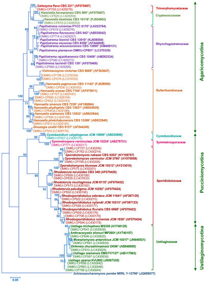 - Surussawadee, J.; Jindamorakot, S.; Nakase, T.; Lee, C.F.; Limtong, S. Hannaella phyllophila sp. nov., a novel basidiomycetous yeast species associated with plants in Thailand and Taiwan. Int. J. Syst. Evol. Microbiol. 2015, 65, 2135–2140. [Google Scholar] [CrossRef]