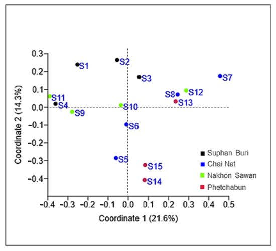 Principal Coordinate Analysis (PCoA) plots of corn phylloplane yeast communities in 15 sampling sites in Thailand, using the Jaccard similarity coefficient.