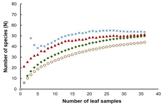 - Yurkov, A.M.; Kemler, M.; Begerow, D. Species accumulation curves and incidence-based species richness estimators to appraise the diversity of cultivable yeasts from beech forest soils. PLoS ONE 2011, 6, e23671. [Google Scholar] [CrossRef]