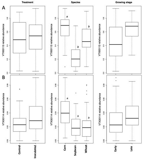 Relative abundance of the most abundant taxon Rhizophagus irregularis (VTX00113 (A) and VTX00114 (B). R. irregularis was represented by an average of 38% of reads across all samples in all three species (wheat, corn, and soybean) tested. Crop species and growth stage had a significant effect on the presence of VTX00113 and VTX00114. Letters a and b show statistically significant differences between variables.