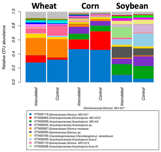Comparing the relative abundance of VT among the three crop species and two inoculation treatments (Figure 2) showed that taxa of the genus Rhizophagus and Funneliformis (VTX00113, VTX00067, VTX00093, and VTX00115) dominated the communities, but they also comprised other genera such as Acaulospora, Diversispora, Claroideoglomus, and other genera as well (Figure 3).