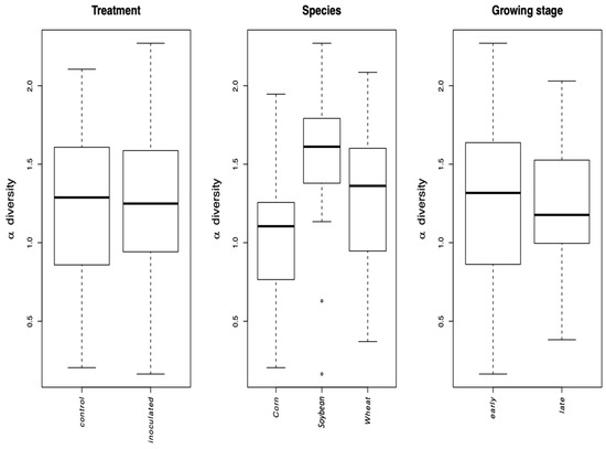 Simpson diversity of virtual taxa (VT) of the different inoculation treatments, crop plant, species, and growth stages. Crop species and growth stage had a significant effect on diversity. Median values and interquartile ranges are shown in the plots.
