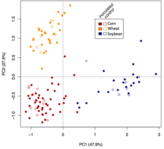 The effect of crop species on the AMF community structure based on principle coordinate analysis (PCoA) of the square root transformed for all the soil samples. Color coding is used to distinguish the three crop plant species (wheat, corn, and soybean) and open and filled circles for the inoculated and non-inoculated treatments.