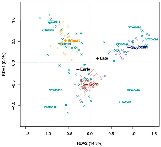 Redundancy analysis (RDA). Note that only the ten most abundant virtual taxa (VT, “X” signs) are labeled, “O” represents samples, and “+” represents centroids of the crop species (wheat, corn, and soybean) and growth stage (early vs. late). The inoculation treatments are not highlighted, as samples did not group accordingly (see Figure 5). The percentage of variance explained is indicated in brackets after the axis labels.
