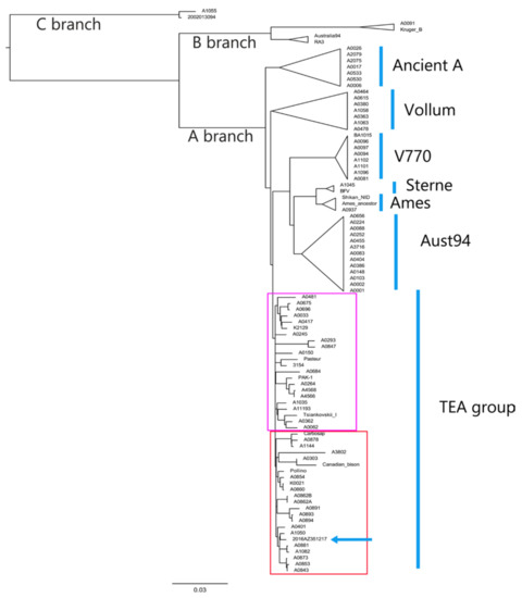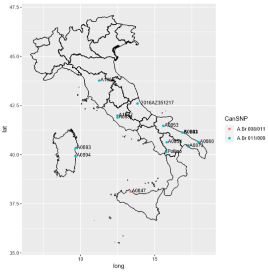 Group A is subdivided into several sub-groups and sub-lineages scattered throughout the world with specific geographic distribution [12,13]. The A.Br. Vollum was found to be dominant in Southern Africa, the A.Br. Aust94 is prevalent in Western and Southern Asia and Western China, the A.Br.001/002 was found in Central and Eastern China, the A.Br.WNA in North America, the A.Br.003/004 in South America, the A.Br.005/006 was found in Australia, Africa, and Europe. Finally the sub-group A.Br.008/009, also known as the Trans-Eurasian (TEA) sub-group, is widespread throughout Europe [14,15] and Russia [16]. It occurs in Southern and Eastern Europe and represents the dominant sub-group in Italy [15]. The TEA splits into two sub-groups A.Br.008/011 and A.Br.011/009, adding a supplemental canSNP [9,17].