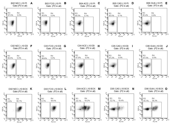 Fluorescence density plots of L. paracasei L-10 in response to staining with propidium iodide (PI) (A–E), ethidium bromide (EB) (F–J), and biz-1,3-dibutylbarbaturic acid [DiBAC4(3)] (K–O) after freeze-drying in the absence (NEC, ●) or presence of fructo-oligosaccharides (FOS, ■) or processing coproducts of acerola (ACE, □), cashew (CAS, ▵), or guava (GUA, ○). L10—L. paracasei L-10. The vertical axis indicates the fluorescence intensity of PI, EB, and DiBAC4(3) and the intensity of lateral light dispersal. The subpopulation of negative stains was blocked in the left rectangles; the positive subpopulation of the stains was delimited in the right rectangles. The percentages of cell subpopulations that fell on each port are shown in each plot.