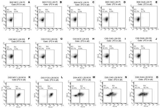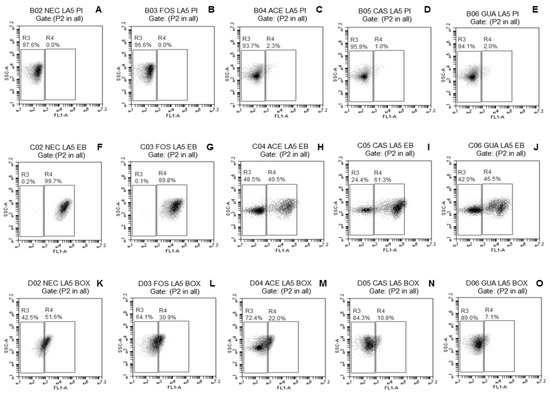 Flow cytometry (FC) analysis was used to monitor the occurrence of damage to different membrane functions of the tested probiotic Lactobacillus strains in the absence (NEC) or presence of FOS, ACE, CAS, or GUA immediately after freeze-drying. Freeze-dried strains in the different treatments were rehydrated in sterile distilled water (30 ± 0.5 °C) for 15 min and centrifuged (4500× g for 10 min at 4 °C). The obtained pellets were washed twice and resuspended in sterile phosphate-buffered saline (PBS; 8.0 g/L of NaCl, 0.20 g/L of KCl, 1.44 g/L of Na2HPO4, and 0.24 g/L of KH2PO4; pH 7.4) and immediately labeled with propidium iodide (PI; Sigma-Aldrich, St. Louis, MO, USA) to evaluate membrane integrity; trimetine oxonol of bis-(1,3-dibutylbarbituric acid) [(DiBAC4(3), or BOX; Molecular Probes, Invitrogen, OR, USA] to evaluate membrane potential; and ethidium bromide (EB; Sigma-Aldrich, St. Louis, MO, USA) to evaluate efflux activity, following previously described cell staining procedures [30,31,32].
