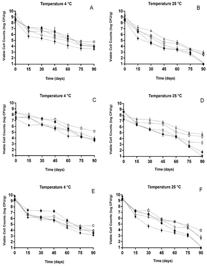 Viable cell counts (log CFU/g) of (A) L. paracasei L-10, (B) L. casei L-26, and (C) L. acidophilus LA-05 freeze-dried in the absence (NEC, ●) or presence of fructo-oligosaccharides (FOS, ■) or processing coproducts of acerola (ACE, □), cashew (CAS, ▵), or guava (GUA, ○) during 90 days of storage at 4 ± 0.5 °C (A,C,E) or 25 ± 0.5 °C (B,D,F).