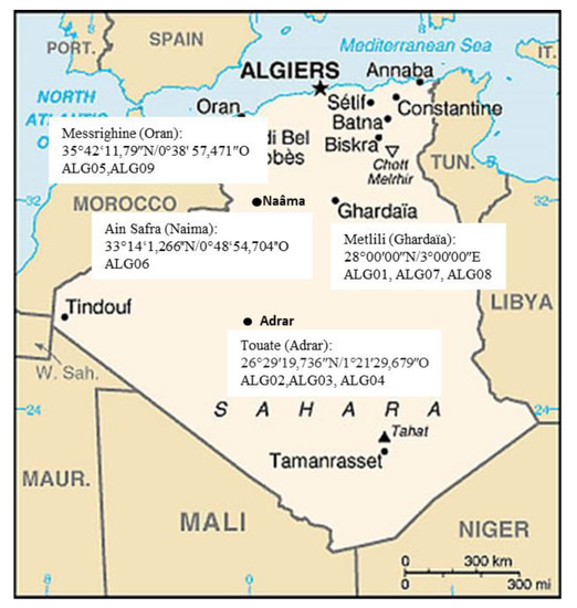 Map of Algeria showing sampling regions of Trichoderma isolates during 2015–2016 (Illustration source: https//www.google.dz/maps).