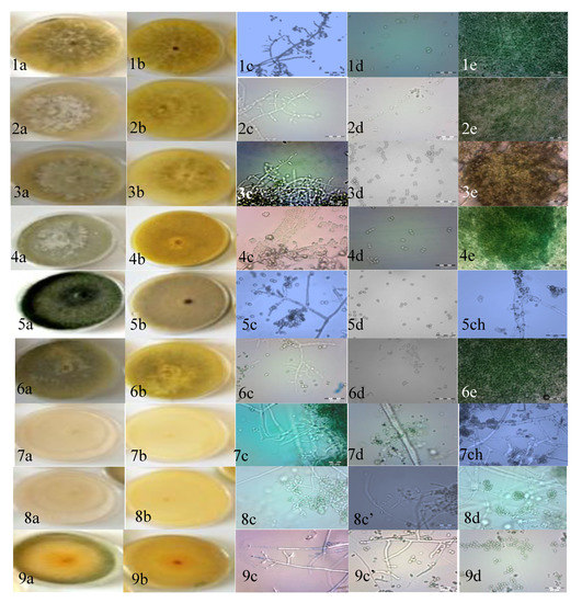 Characteristics like colony appearance, growth rate, and sporulation patterns were recorded [31,32]. In order to assess the growth rate, the colony diameter of each strain growing on the PDA was measured at 24 h intervals, until the colony covered the plate.