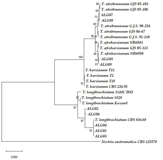 The results of BLAST analysis of the sequences of the ITS showed that five out of nine strains, ALG01, ALG02, ALG03, ALG04, and ALG06, were 100% identical to T. longibrachiatum, which corresponds to the results found in the microscopic study. The ALG07, ALG08, and ALG09 strains were 100% identical to T. harzianum, and ALG05 was 100% identical to T. afroharzianum. However, the ITS region is not considered appropriate on its own to delineate species in Trichoderma, as different species may share 100% ITS sequence identity [24,33,44].