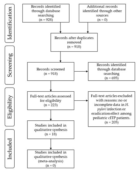 A flow diagram of study identification, inclusion, and exclusion is provided in Figure 1. The searches of PubMed and ICHUSHI using the defined terms yielded a total of 928 records. After 10 duplicates were removed, 918 records remained for the title and abstract screen. A total of 695 records were excluded based article type (reviews, case reports, irrelevant experiments, incomplete data). After full-text assessment of the 223 remaining records, we finally identified and reviewed 18 studies [,,,,,,,,,,,,,,,,,] consisting of two RCTs and 16 NRCTs (case-controlled, or retrospective studies, or case series) with sufficient data relating to H. pylori infection and the efficacy of H. pylori eradication therapy in pediatric patients with cITP. Characteristics of the 18 studies are summarized in Table 2. They were published between 2003 and 2015. We extracted the data of 706 pediatric patients with cITP persistent thrombocytopenia (platelet count <150,000/μL) for longer than 6 months, including 164 patients with H. pylori infection from these previous studies (Table 2).
