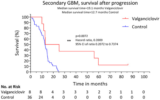 Kaplan–Meier estimates of median overall survival (OS) after progression. Estimated median OS after progression to glioblastoma for 8 patients with secondary glioblastoma who received valganciclovir therapy (red) and for 36 contemporary controls who received similar second-line therapy (blue). **: the level of significance of the p value (p = 0.0072) indicated with the symbol ** by the statistical program used, Graphpad v. 8.