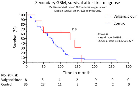 To our knowledge, this is the first report describing the use of valganciclovir in patients with secondary glioblastoma. In accordance with the survival data for patients with newly diagnosed glioblastoma, who survived longer when treated with valganciclovir than patients receiving only the standard of care, we also show that patients with secondary glioblastoma may benefit from anti-viral therapy. These patients survived 6.4 months longer than their controls (p = 0.0072). As was reported by Hamisch et al., we did not observe a better prognosis among patients with secondary glioblastoma than among patients diagnosed with primary glioblastoma. However, we did not have information about IDH mutation status for most patients, which has been shown to influence the survival chances for these patients [3,4,5,6]. Although this small patient cohort only included eight valganciclovir-treated patients, their benefit from this drug was statistically significant. Thus, targeting CMV in glioblastoma continues to show potential treatment benefits, representing a promising new therapy option, in need of further evaluation in randomized trials.