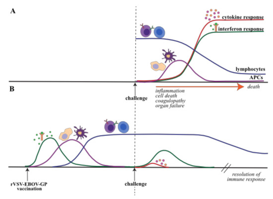 Host response to EBOV infection and rVSV-EBOV-GP vaccination. (A) EBOV infection induces a strong, sustained secretion of cytokines and interferon by myeloid cells. Impaired activation of APCs coupled with apoptosis induced by pro inflammatory mediators cumulates in lymphocyte death, preventing the host from mounting an effective adaptive immune response. excessive inflammation, coagulopathy and diffuse organ failure precedes death of the host. (B) In contrast, rVSV-EBOV-GP vaccination induces a regulated antiviral interferon response in the absence of the cytokine storm seen in EBOV infection. Effective activation and mobilization of antigen presenting cells (APCs) enables a robust.