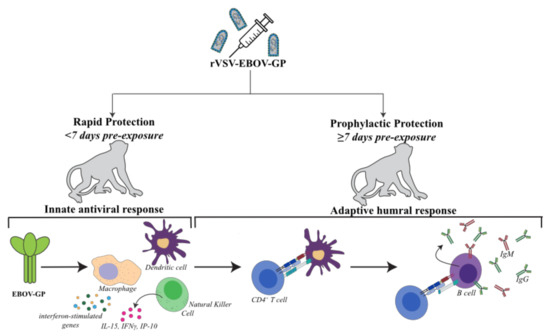 In addition to the role of humoral immunity, there is a clear role for innate immunity in rVSV-EBOV-mediated rapid protection (defined as protection conferred when vaccination occurs <7 days before challenge) (Figure 2). Partial protection is conferred to macaques vaccinated with rVSV-EBOV-GP as late as 1–3 days before EBOV challenge before the appearance of GP-specific antibodies. Interestingly, partial protection (67%) was also reported in NHPs that were vaccinated twice with rVSV-MARV-GP (which shares <70% nucleotide identity with EVOV-GP), at 1 h and 24 h after EBOV [56,79,98]. These data suggest a critical role for innate immune responses engendered by rVSV in the mediating early protection.