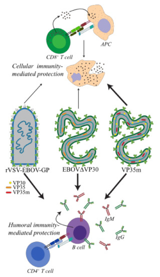 Humoral immunity is believed to be the major mechanism of protection provided by prophylactic rVSV-EBOV-GP vaccination while cellular immunity plays a smaller role. Vaccination with VP35m induces notable T and B cell responses. Protection mediated by the replication incompetent EBOV ΔVP30 likely provokes mainly humoral responses.