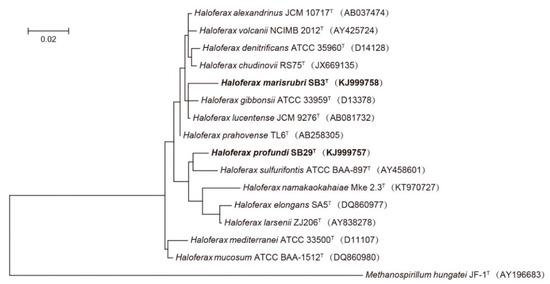 All phylogenetic analyses are in agreement and show that both strains branch separately from the existing validly described species of the genus Haloferax, indicating that these strains represent novel species (Figure 1, Figures S6 and S7). Based on the results of the genomic assembly, both genomes are estimated to be 99.0% complete. The draft genome of SB29T is 3,871,125 bp in size with 771 contigs, 57 scaffolds, and a 136-fold coverage; the draft genome of strain SB3T is 3904,985 bp in size with 66 contigs, 26 scaffolds, and a 154-fold coverage. A total of 4053 ORFs, 47 tRNAs, and 2 rRNAs are predicted for strain SB29T, and a total of 3824 ORFs, 51 tRNAs, and 2 rRNAs are predicted for strain SB3T. The DNA G + C contents for strain SB29T and SB3T are 60.75% and 65.64%, respectively, which are very similar to those reported for other Haloferax species (Table 1). The genomic data suggests that both strains SB29T (1473 bp) and SB3T (1446 bp) only possess one copy of the 16S rRNA gene.