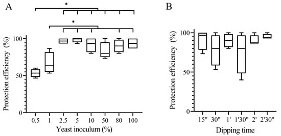Efficiency of Clavispora lusitaniae 146 to protect lemon wounds against Penicillium digitatum according to the yeast concentration (A) and dipping time (B). (A) The values on the horizontal axis indicate the percentage of the dilution prepared from an initial concentration (100%) of 3.06 × 108 colony forming units (CFU) mL−1. (B) Dipping times from 15 s to 2.5 min were tested. Significant differences in the efficiency are indicated by asterisks according to Tukey’s test (* indicates p < 0.05, n = 4).